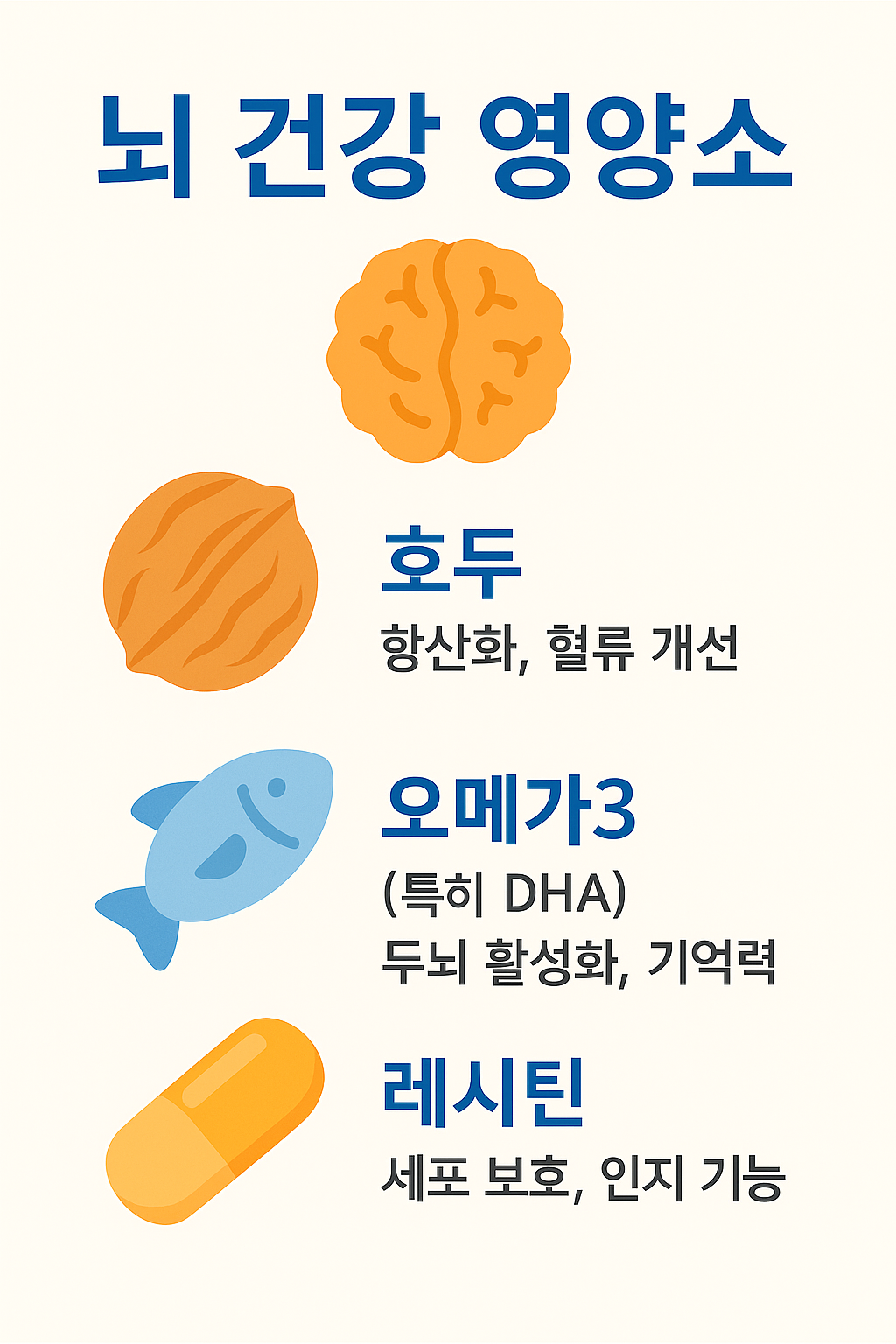 목차왜 뇌 건강에 영양소가 중요한가?뇌 건강에 좋은 대표 영양소 기능별 비교: 기억력, 집중력, 세포 보호섭취 방법 및 일일 권장량결론: 개인 맞춤형 조합 전략1. 왜 뇌 건강에 영양소가 중요한가?뇌는 체내에서 에너지를 가장 많이 소모하는 기관 중 하나로, 신경세포 간 신호 전달, 사고, 기억, 감정 조절 등 복합적 기능을 수행합니다. 하지만 노화, 환경 독소, 스트레스 등으로 인해 신경세포는 손상되기 쉬우며, 이는 인지 저하와 집중력 저하, 치매 위험 증가로 이어질 수 있습니다.✅ 따라서 뇌 기능 저하를 예방하기 위해, 특정 영양소의 체계적인 섭취는 매우 중요합니다.2. 뇌 건강에 좋은 대표 영양소 3가지2-1. 🥜 호두주요 성분: 알파-리놀렌산(ALA), 비타민 E, 폴리페놀기능: 항산화 작용, 신..