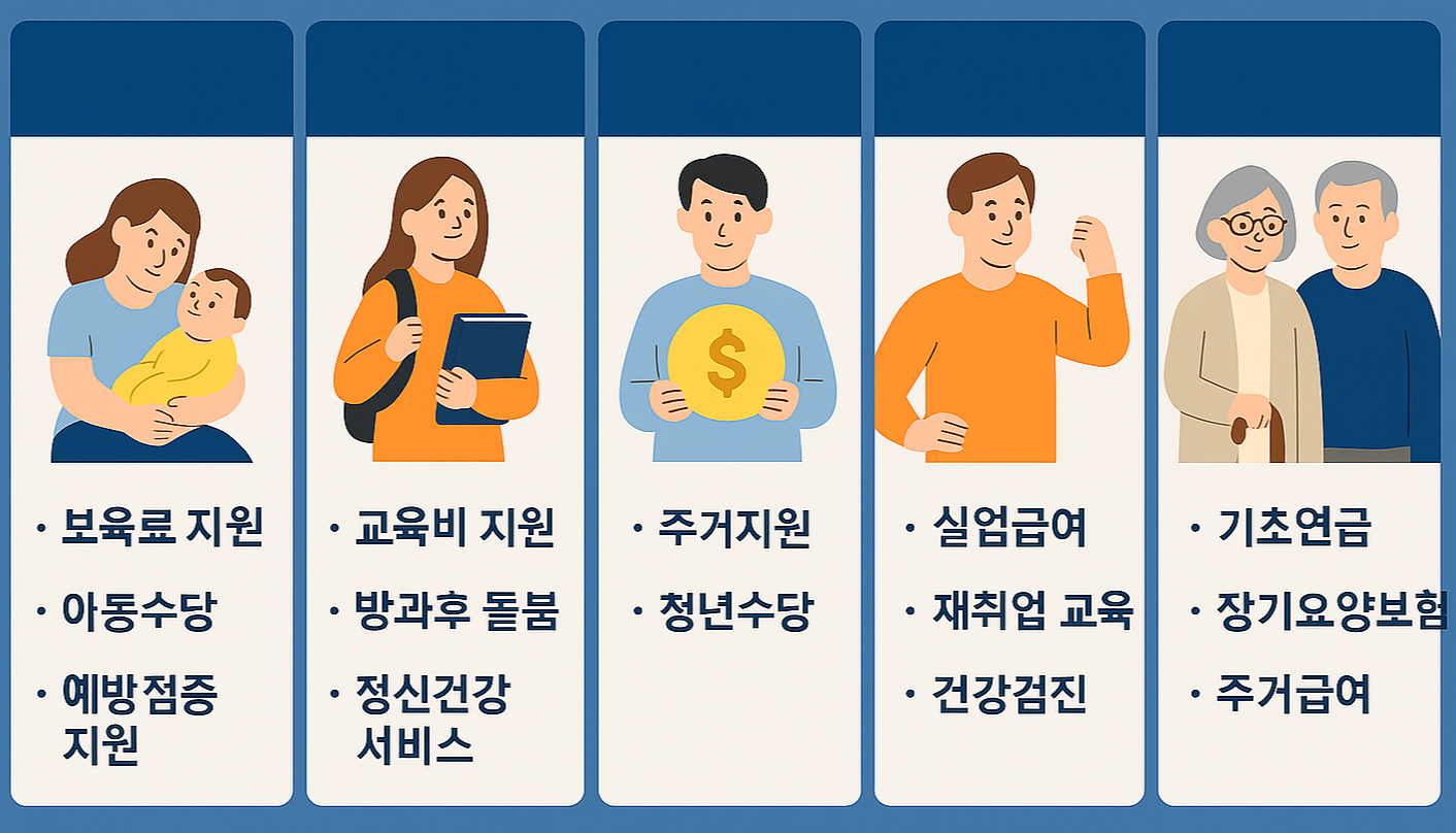 - 노년기: 기초연금, 장기요양보험, 독거노인 돌봄 서비스