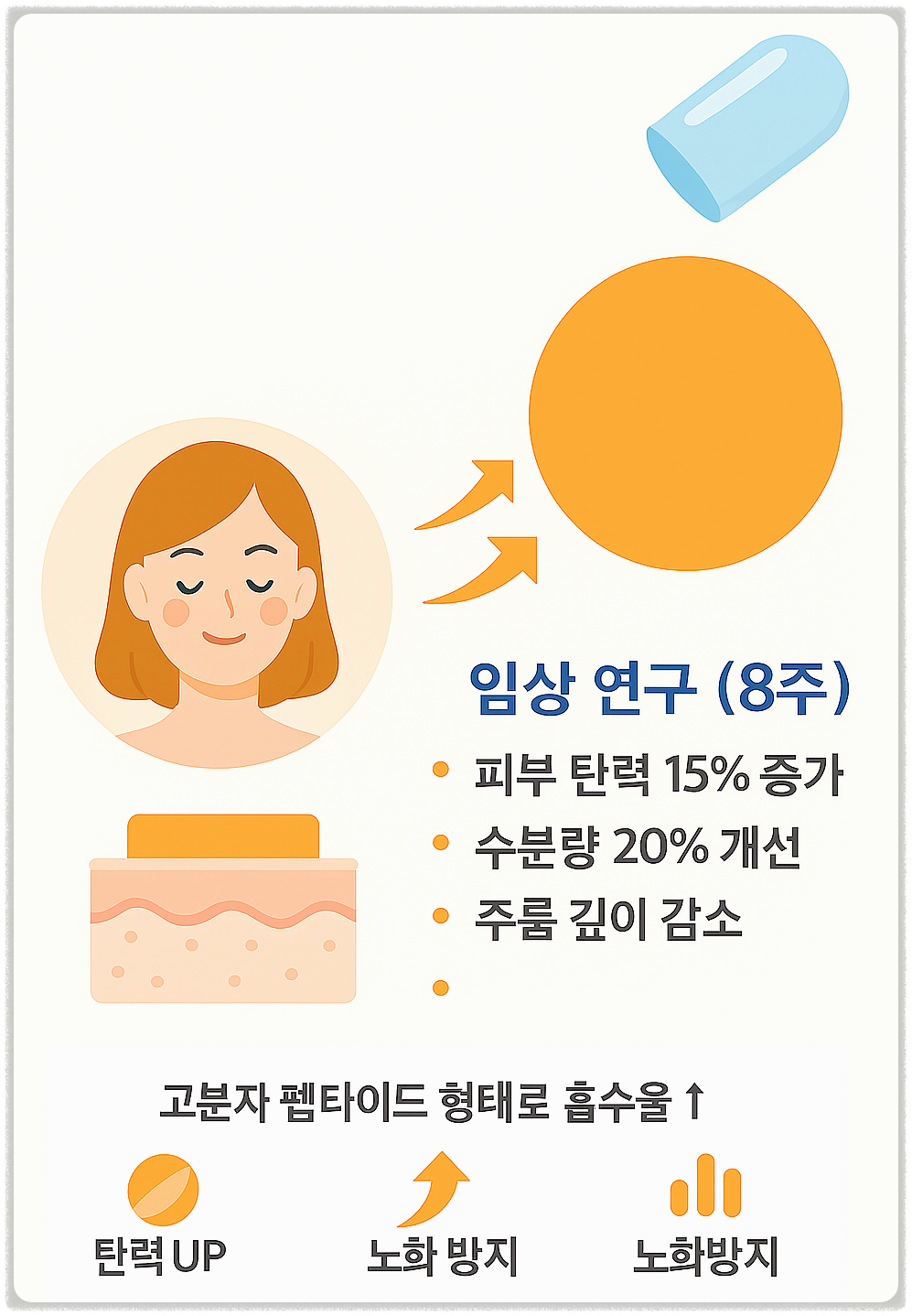 위 연구에서는 8주간 2.5g의 콜라겐 펩타이드를 복용한 여성들이 피부 탄력, 수분량, 거칠기 지표에서 유의미한 개선을 보였다고 보고했습니다.