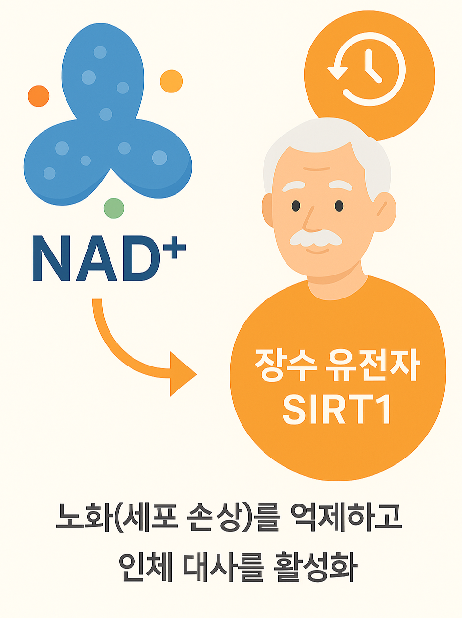 📑 목차NAD+란 무엇인가?NAD+ 수치와 인체 기능의 상관관계장수 유전자 SIRT1의 역할NAD+와 SIRT1의 상호작용: 과학적 연구 사례NAD+를 증가시키는 방법결론: 건강수명을 위한 NAD+ 관리 전략1. NAD+란 무엇인가?NAD+(Nicotinamide Adenine Dinucleotide)는 모든 생명체 세포에 존재하는 조효소로,세포 대사, 에너지 생성, DNA 복구, 유전자 발현 조절 등 생명 유지에 필수적인 작용을 수행합니다.특히 NAD+는 **산화환원 반응(REDOX)**에 관여하여 ATP 생성, 즉 세포 에너지 대사의 중심축으로 작용합니다.하지만 NAD+는 나이가 들수록 점진적으로 감소하며, 이는 다양한 노화 및 퇴행성 질환의 직접 원인이 되기도 합니다.📉 40대 이후부터 NAD+..