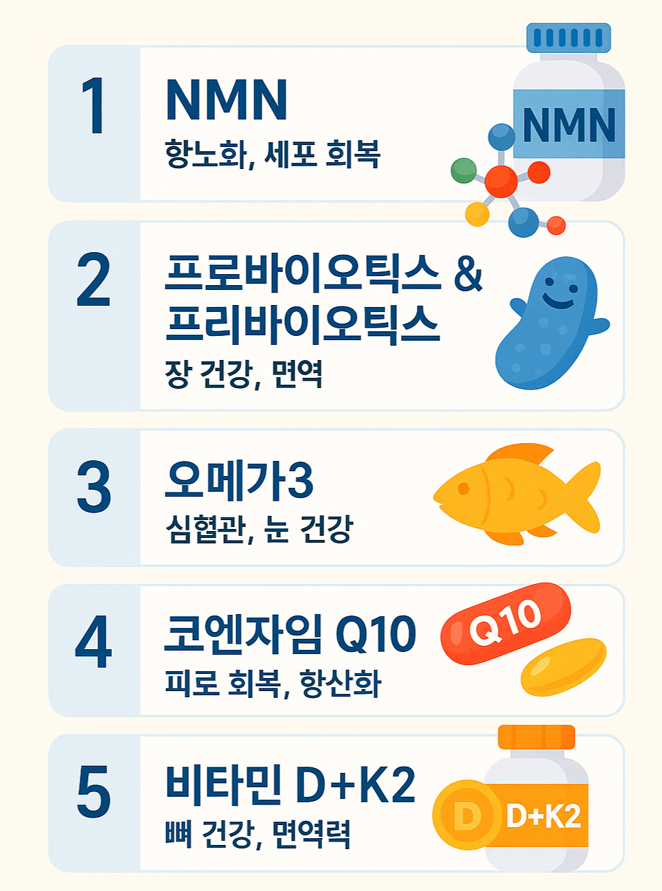 📑 목차건강기능식품 시장, 왜 지금 다시 주목받는가?2025년 추천 건강기능식품 TOP 5 선정 기준건강기능식품 순위 TOP 5 상세 분석 3-1. NMN (니코틴아마이드 모노뉴클레오타이드) 3-2. 프로바이오틱스 & 프리바이오틱스 복합 3-3. 오메가 3 (EPA/DHA 고함량 제품) 3-4. 코엔자임 Q10 3-5. 비타민D+K2 복합제건강기능식품 섭취 시 주의할 점결론 및 소비자 추천 가이드1. 건강기능식품 시장, 왜 지금 다시 주목받는가?코로나19 팬데믹 이후 건강에 대한 인식이 크게 변화하면서, 건강기능식품 시장은 전 세계적으로 폭발적인 성장세를 보였습니다.대한민국 식품의약품안전처에 따르면, 2024년 기준 국내 건강기능식품 시장은 약 6조 8천억 원에 달하며, 2025년에는 7조 원을 넘어설..